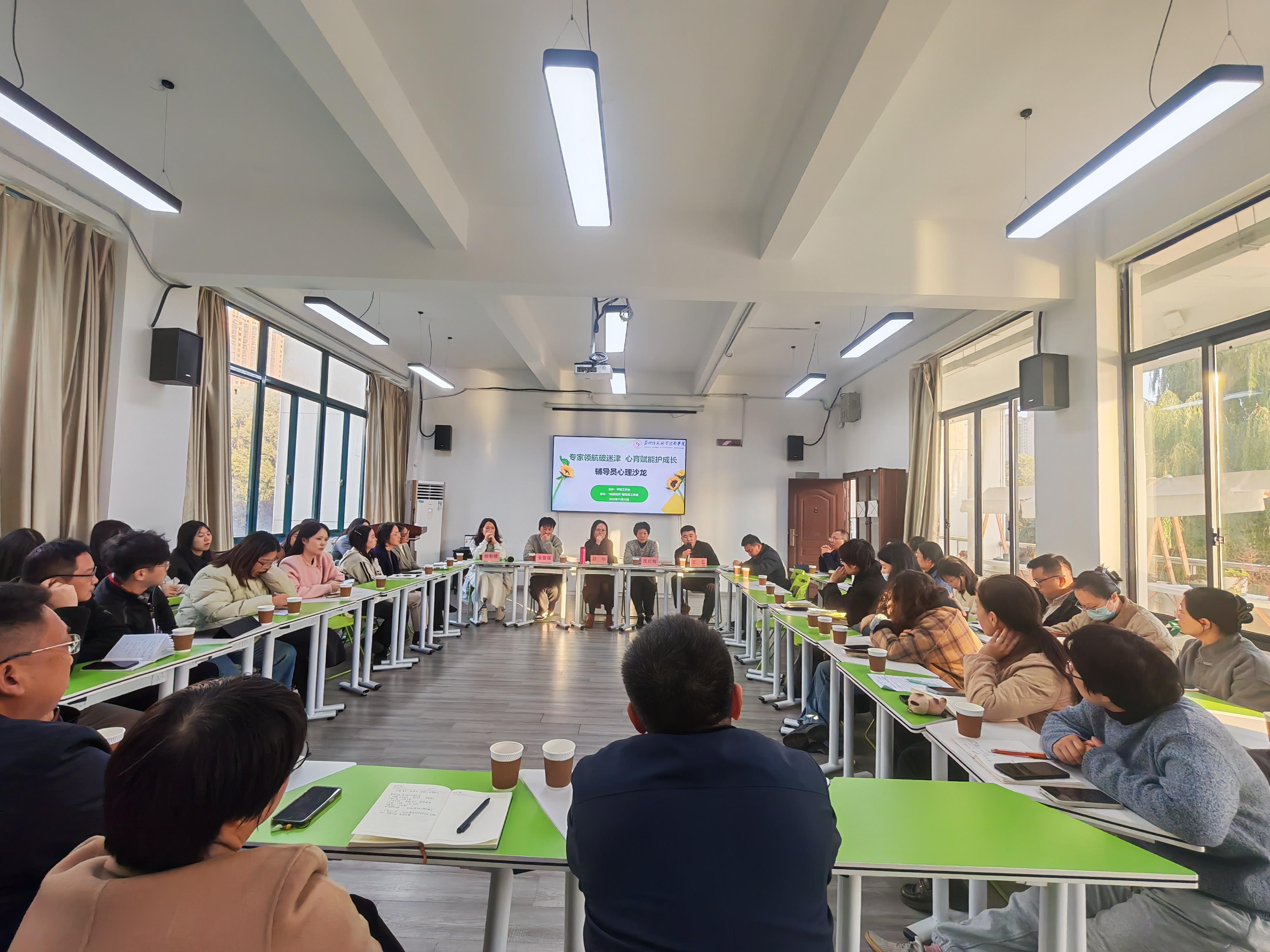 讲座结束后,吕华与专家团队围绕“专家领航破迷津,心育赋能护成长”主题,与全体辅导员展开沙龙交流。沙龙聚焦辅导员在实际工作中的难点与困惑,重点围绕“心理健康问题的沟通和引导、家校协同困境破解、辅导员自我关怀与职业平衡”等核心议题进行深入研讨。