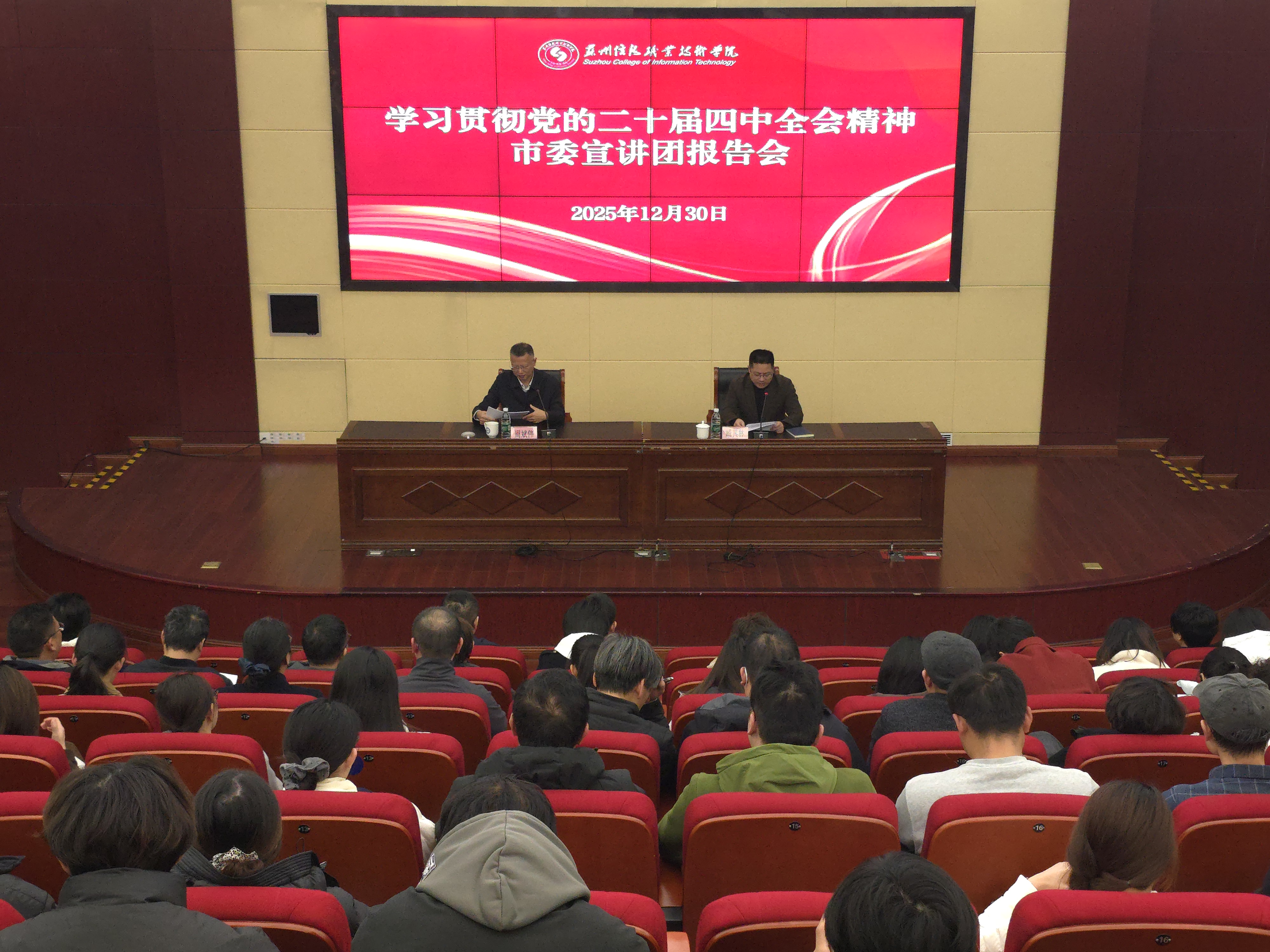 根据苏州市委统一部署,12月30日,学习贯彻党的二十届四中全会精神市委宣讲团报告会在我院举行。市委宣讲团成员、市委政法委常务副书记周斌伟作宣讲报告。我院党委书记臧其林主持报告会,学院领导、全体副科长以上干部、思政课教师、专业(学科)负责人, 以及学生代表参加。
