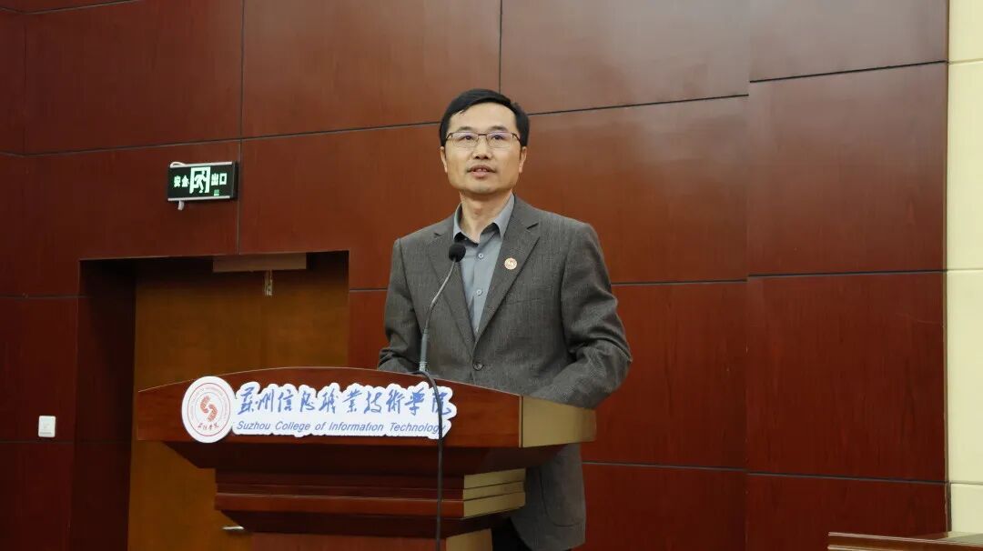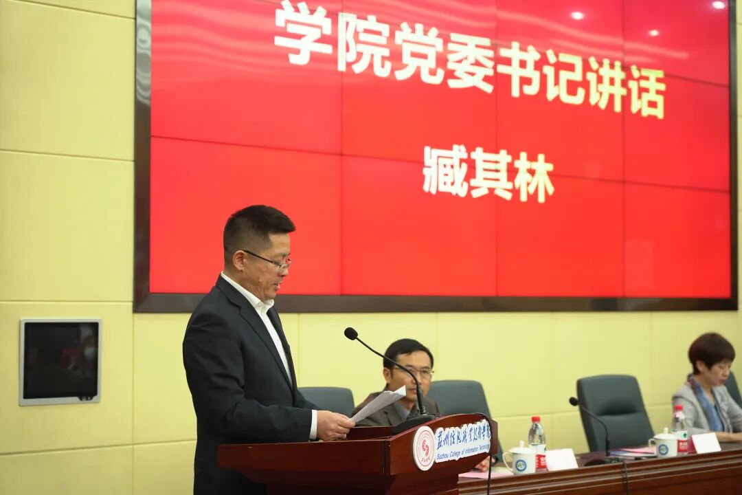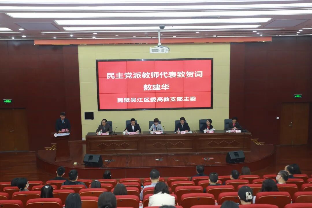 民盟吴江区委高教支部主委、我院教务处负责人敖建华,代表民主党派致贺词,表示将同党外知识分子一起,在学院党委的领导下,积极投身学院各项工作,为学院推进高质量发展、建设高水平职业院校作出更大的贡献。