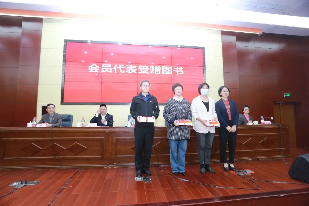 吴江区委统战部副部长孙阿利,为新当选的会长、副会长、秘书长赠书。