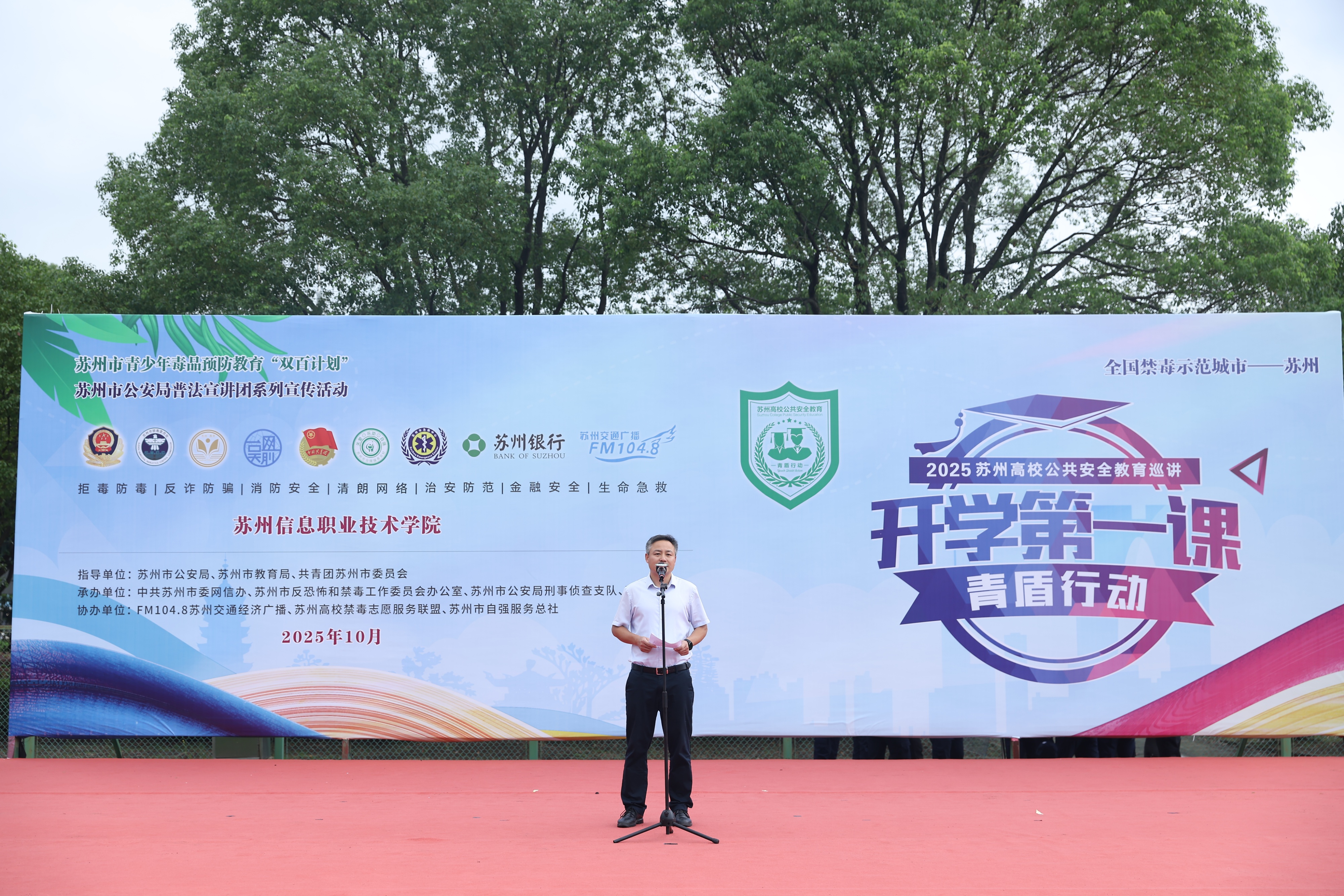 10月16日下午,2025年“青盾行动”苏州高校公共安全教育“开学第一课”闭幕仪式在我院举行。活动由苏州市公安局、市教育局、团市委指导,我院联合市禁毒办等单位承办。我院党委委员、副院长张成,市禁毒办负责同志,我院后勤处(安保处)、学生工作处、各系学生工作负责同志、新生辅导员及2025级全体新生参加活动。
